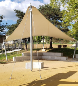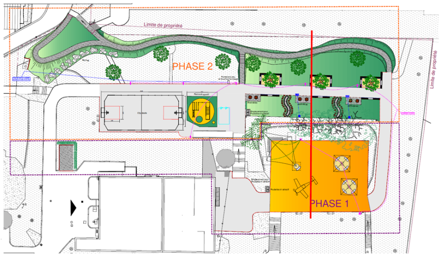 Les aménagements proposés scindent les cours en 3 espaces distincts reliés par des cheminements créant 3 ambiances de natures différentes : une principale de secteur à « palabre », une sportive et une dernière plus environnementale.